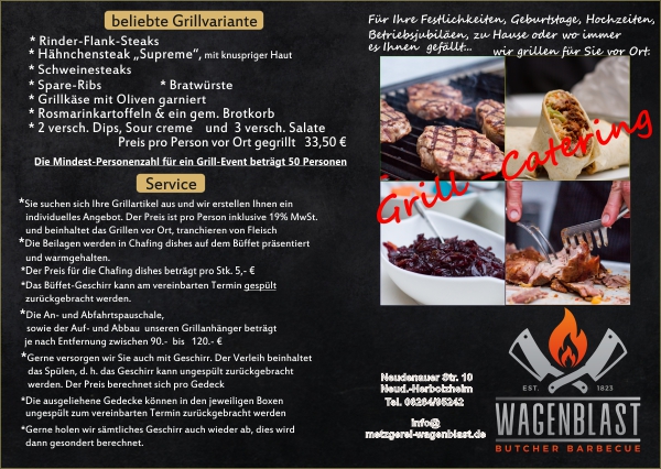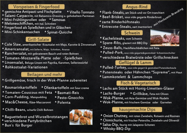 Am schönsten sind doch die Feste draußen an einem schönen Frühlings- oder Sommerabend. Lassen Sie sich bei Ihrem Familienfest oder bei Vereins- oder Firmenfeiern von unseren Grillprofis mit einer großen Auswahl ausgesuchter Spezialitäten vom Grill verwöhnen. Frisch und heiß auf den Teller!